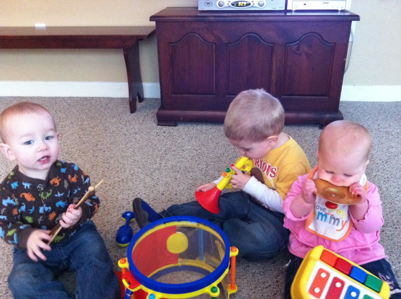 I was beyond tickled pink when my beloved, hysterical friend and fellow SAHM, Sara Webster, agreed to guest blog for me. I’m lucky, b/c as her friend, I get to LOL on an almost daily basis at her witty commentary on raising young children. God bless her, she watched my children one day recently (overnight to be exact–is she a saint?!). She snapped this pic of my kids rockin’ out with her 13 mo. son, Liam (FYI–she is also pregnant with her second [due in June], going to school full-time, teaching Spanish lessons, providing childcare for another family, singing on the worship team and serving as a youth leader for our church–okay, so yeah…she definitely is a saint) . These were her thoughts–enjoy!: