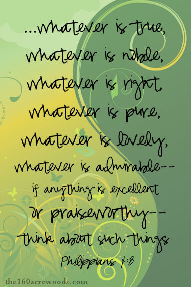 As a natural worrier, it is so easy for me to get fussed up about things that aren’t true and that will likely never come to pass (i.e. our house will probably not be attacked by a random gang of burglars, nor will my daughter grow up socially stunted b/c I skipped playgroup last week). Focusing on this kind of stuff really isn’t productive or helpful. So I’m going to take this verse to heart as a much-needed reminder to pay attention to the stuff that I know to be true right now: