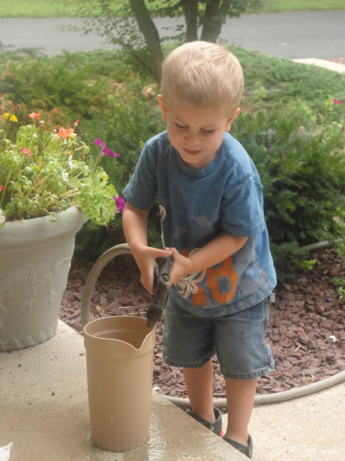 My son discovered the hose and his nearby bucket and spray bottle. Probably will not get points for water conservation here, but he had a blast filling up an old pitcher from the hose, filling up his spray bottle from the pitcher and proceeding to water each and every flower bloom and leaf in the porch area over and over again…and over and over again.
